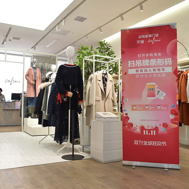 与此同时,伊芙丽与天猫一起在杭州西溪印象城中庭,搭起了一台给顾客体验新零售的大舞台。11月10日10时亮相的“新衣缺失症”快闪店,既可以现场购物,也可以“码上淘”手机下单;全新的新零售道具虚拟试衣镜首次亮相,顾客可以不用试穿,直接在试衣镜前模拟自己的身材比例,直观看到各款服装上身效果,还可以体验自由搭配的乐趣。最后手机淘宝或天猫扫描生成的二维码,即可保存试穿记录,并且线上下单。